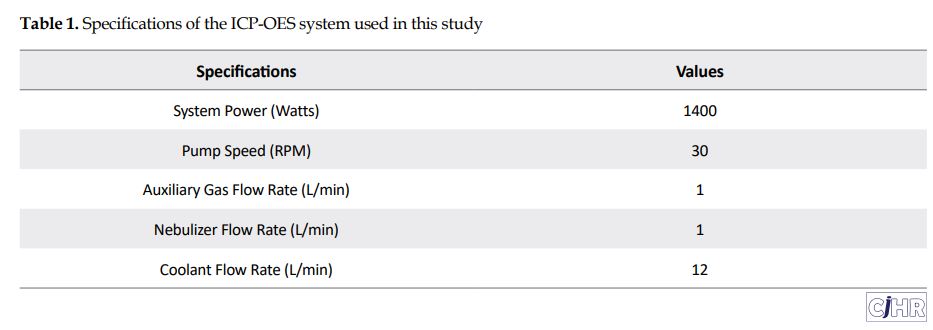 The samples were analyzed using inductively coupled plasma optical emission spectrometer (ICP-OES) (ICP-OES made by Spectro Ametek in Germany) [9-11] The specifications of the ICP system used in this study are presented in Table 1.