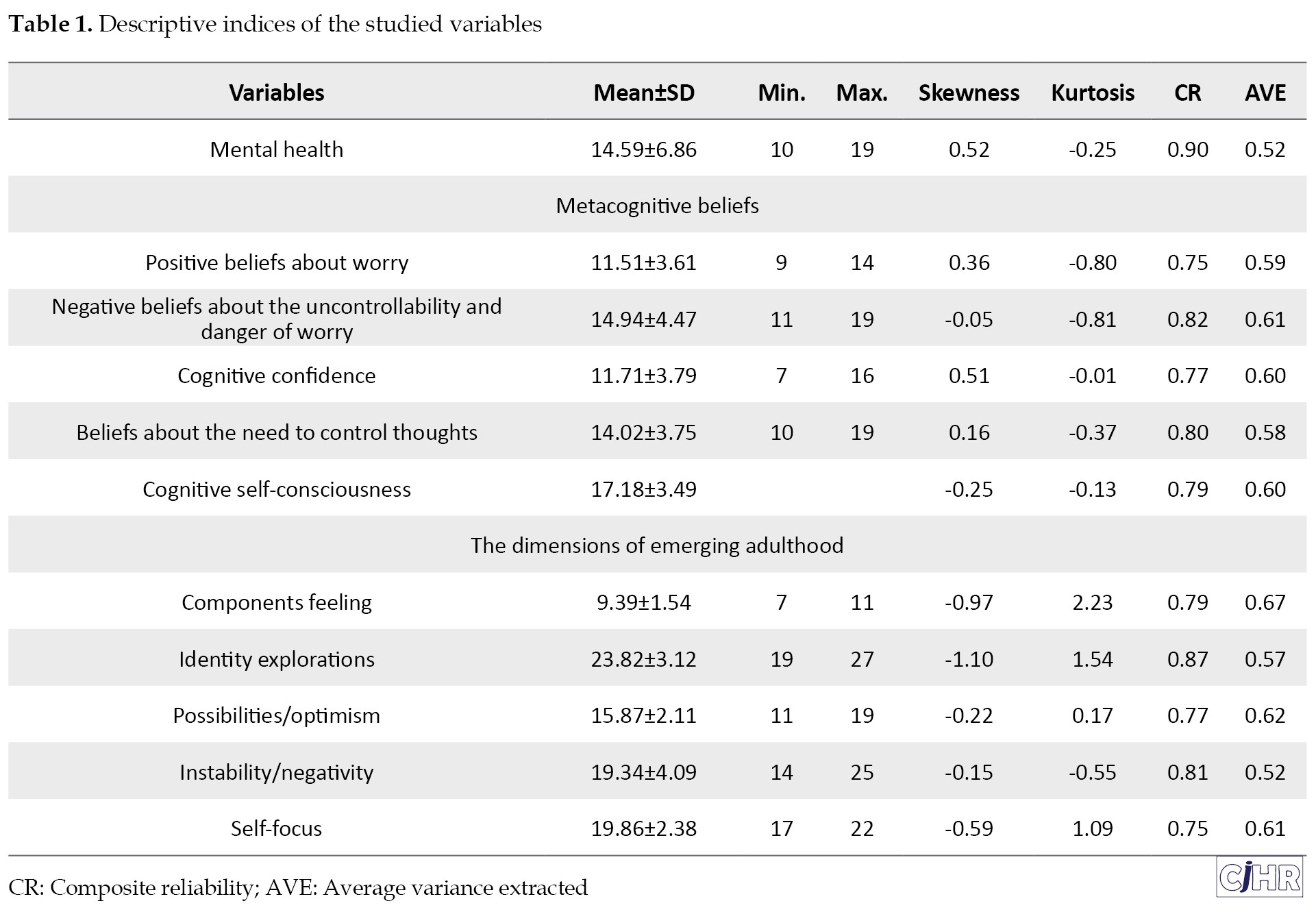 According to the research principles, a model was developed and the model parameters were estimated by the method of partial least squares. Metacognitive beliefs were exogenous variables. Mental health was the mediating variable of the model, which was defined as a latent variable. EA components were introduced as endogenous, dependent, and latent variables. To measure the fit of the research conceptual model, Structural Equation Modeling (SEM) was used, which is a kind of latent variable analysis, which allows sets of multiple regression equations to be tested simultaneously to test the relationships between variables. After specifying the model, an estimation of overall goodness of fit of the model with the observed data was performed. Research data were described through mean and standard deviation. Correlation matrix was reported using Pearson correlation coefficient. Data analysis was conducted in SPSS software, version 22 and SEM was performed using SmartPLS-3 software. The reliability of the variables was evaluated in Composite Reliability (CR), which is a measure of the internal fit of the model, in the SmartPLS-3 software. Convergent validity of latent variables was tested with the Average Variance Extracted (AVE). Convergent validity was defined as AVE greater than or equal to 0.50.