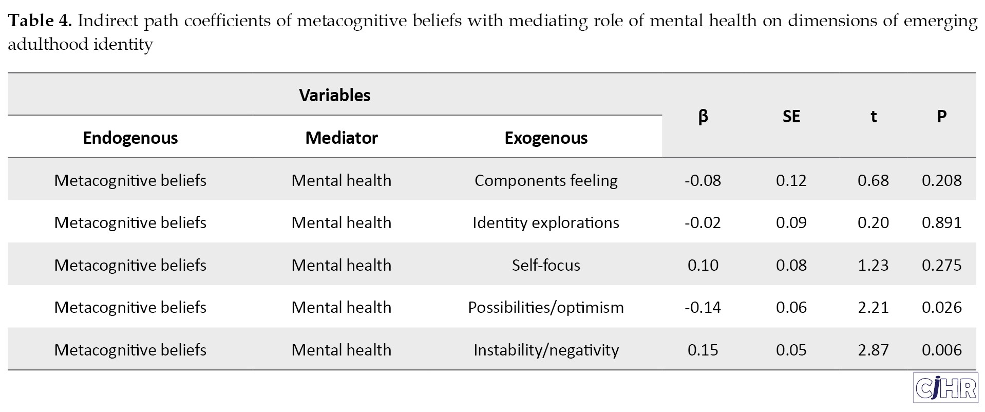Table 2 showed that components of metacognitive beliefs had a positive relationship with mental health, a negative relationship with possibilities/optimism, and a positive relationship with the other four components of EA.