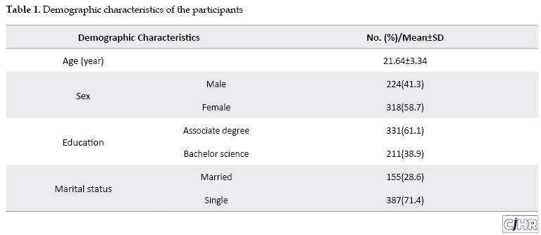 In the current cross-sectional investigation, 542 students of Mashhad Universities of Applied Sciences were collected using cluster sampling method. For sampling, the desired university centers were first randomly selected with the cluster sampling method, and then students are randomly selected based on the list of students within the clusters. The research protocol was approved by the Mashhad University of Medical Sciences. The inclusion criteria for the present study include: individuals’ willingness to enter the study, being a student, and Iranian citizenship. Also, lack of consent to participate in the study and incomplete completion of the questionnaires were considered as exclusion criteria.