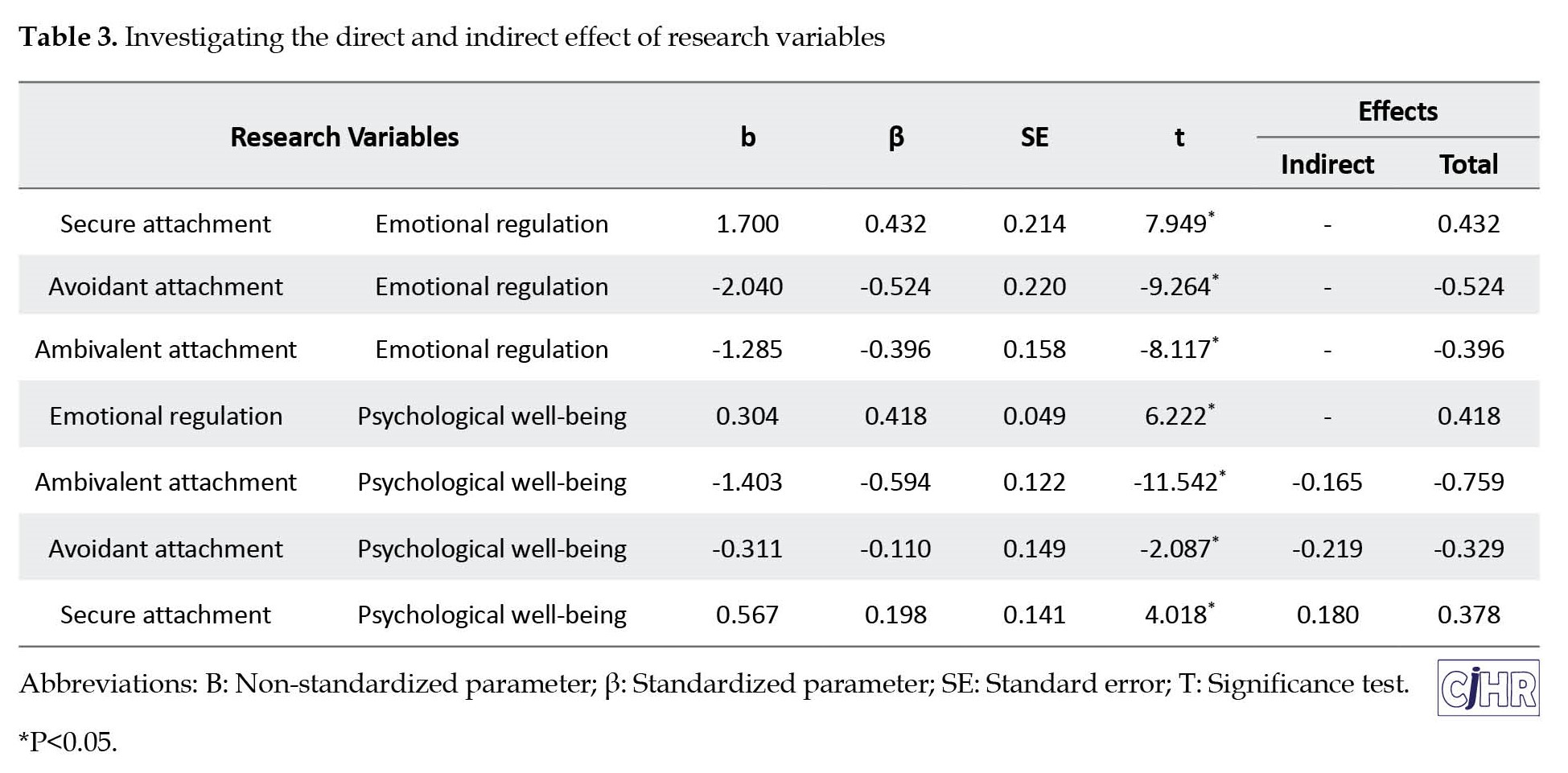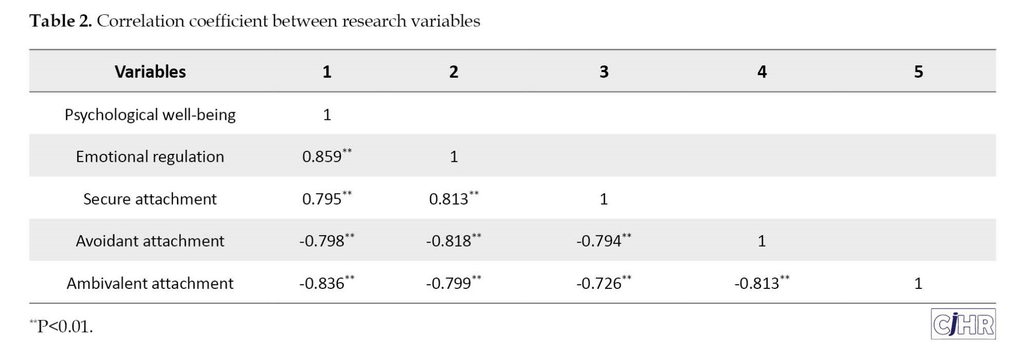 As it is evident, the correlation coefficient between the psychological well-being variable and the emotional regulation variable is 0.859 at the significance level of 0.01, which indicate a positive and very strong association. There is also a direct and strong association between psychological well-being and secure attachment style (r=0.795, P<0.01). in contrast, psychological well-being showed an inverse and strong association with avoidant and ambivalent attachment style.