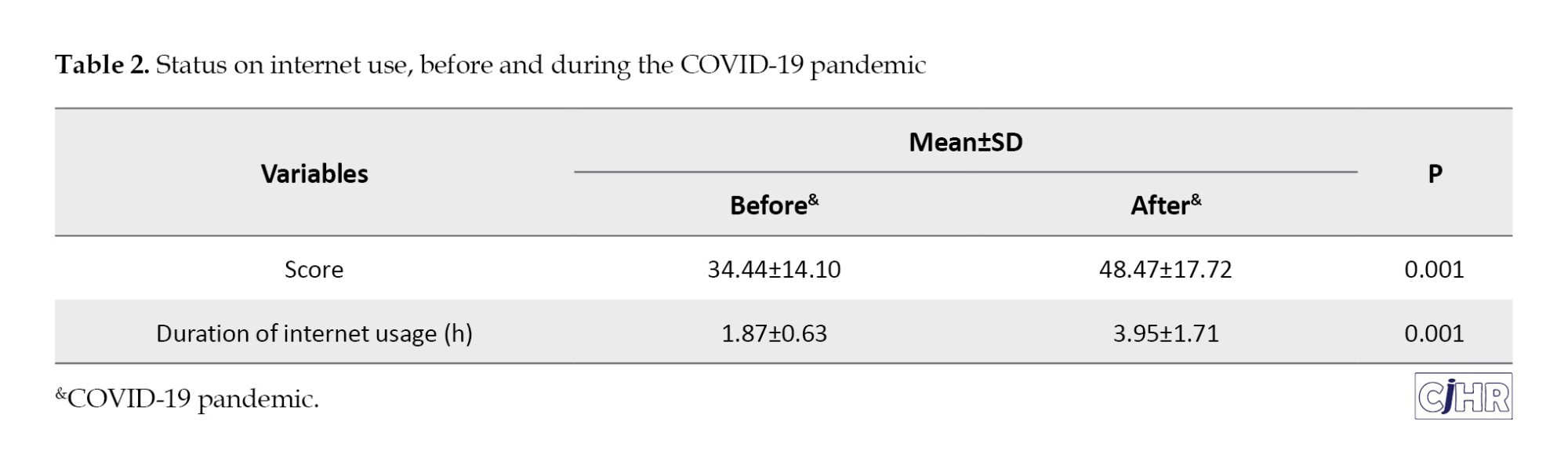 Table 2 shows the score and duration of Internet usage before and after the COVID-19 pandemic.