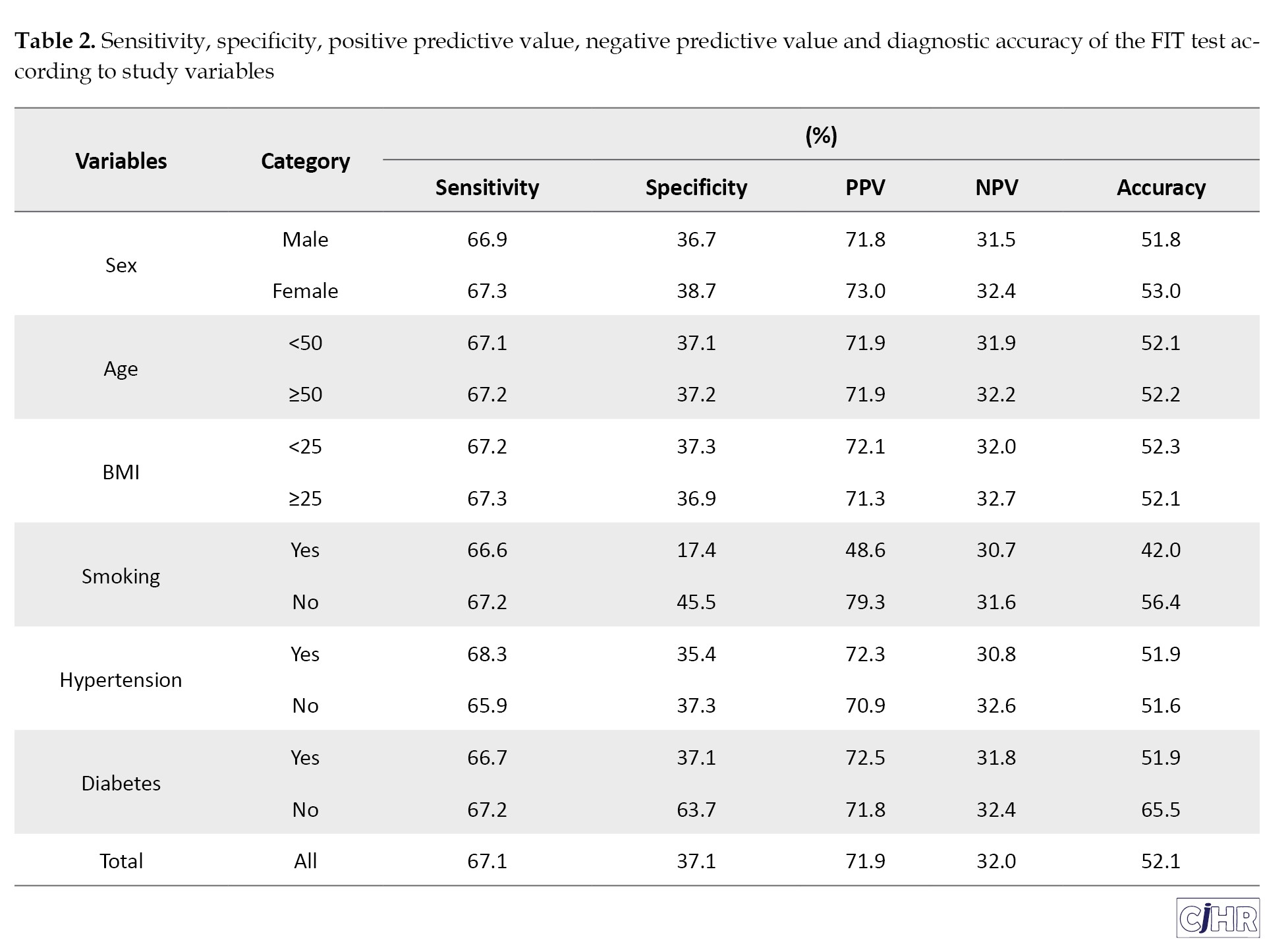 In this study, the sensitivity and specificity of FIT were 67.1% and 37.1%, respectively. In some studies, the specificity of FIT was reported to be 94%, which is not consistent with the present study [21, 22]. In the study of Song et al, the sensitivity of FIT was reported as 73.8% [16]. In this study, the negative predictive value of the FIT test was only 32.0%. The negative predictive value indicate percent of the cases that the test reported as negative and they are healthy. This index is the proportion of really healthy people. Since both healthy and sick cases are included in the calculation of these ratios the predictive value of a test in different societies with different prevalence values it will be different. In this way, whatever the prevalence of a disease if it is less, the negative predictive value of that diagnostic test will be higher. On the other hand, the higher the prevalence of a disease, the more positive the predictive value that test will be.