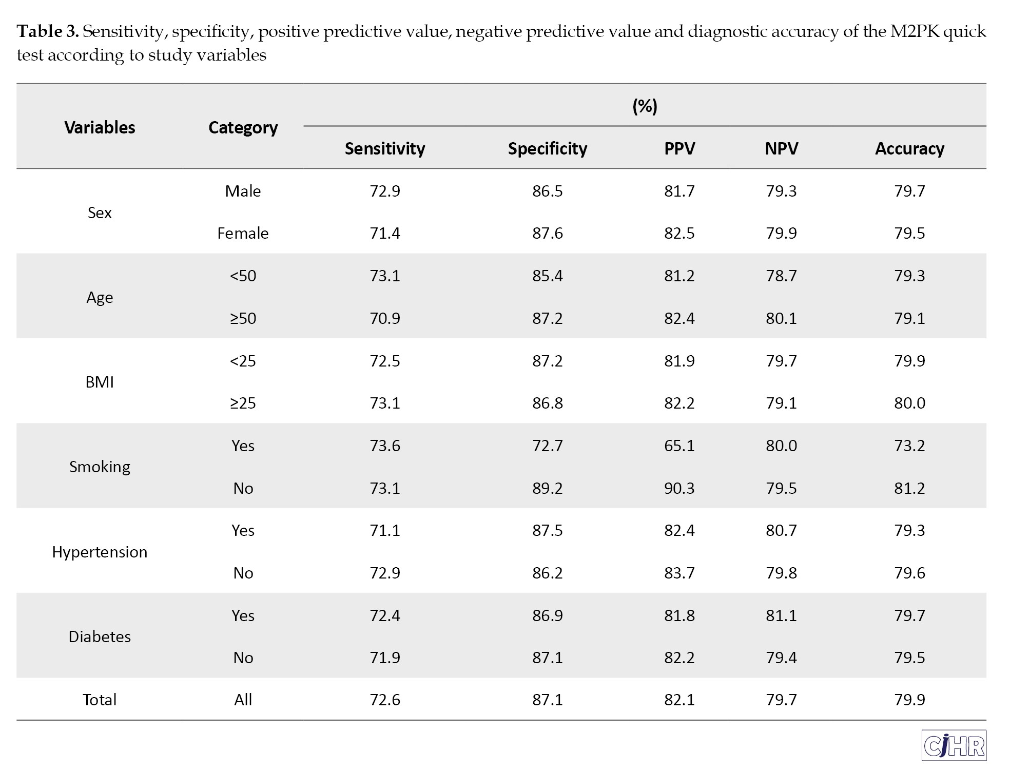 Of the 768 participants, 54.7% were women. The mean age of participants was 51.5±14. 6 years. Demographic differences among the M2PK and FIT groups showed that in the FIT group, women had the largest population (57.3 %), and in the M2PK group, men had the largest population (52.1%). In both groups, most participants were in the age group of less than 50 years. Also, most participants had a BMI<25. Comparison of patients with and without colonoscopy lesions by demographic and clinical characteristics are described in