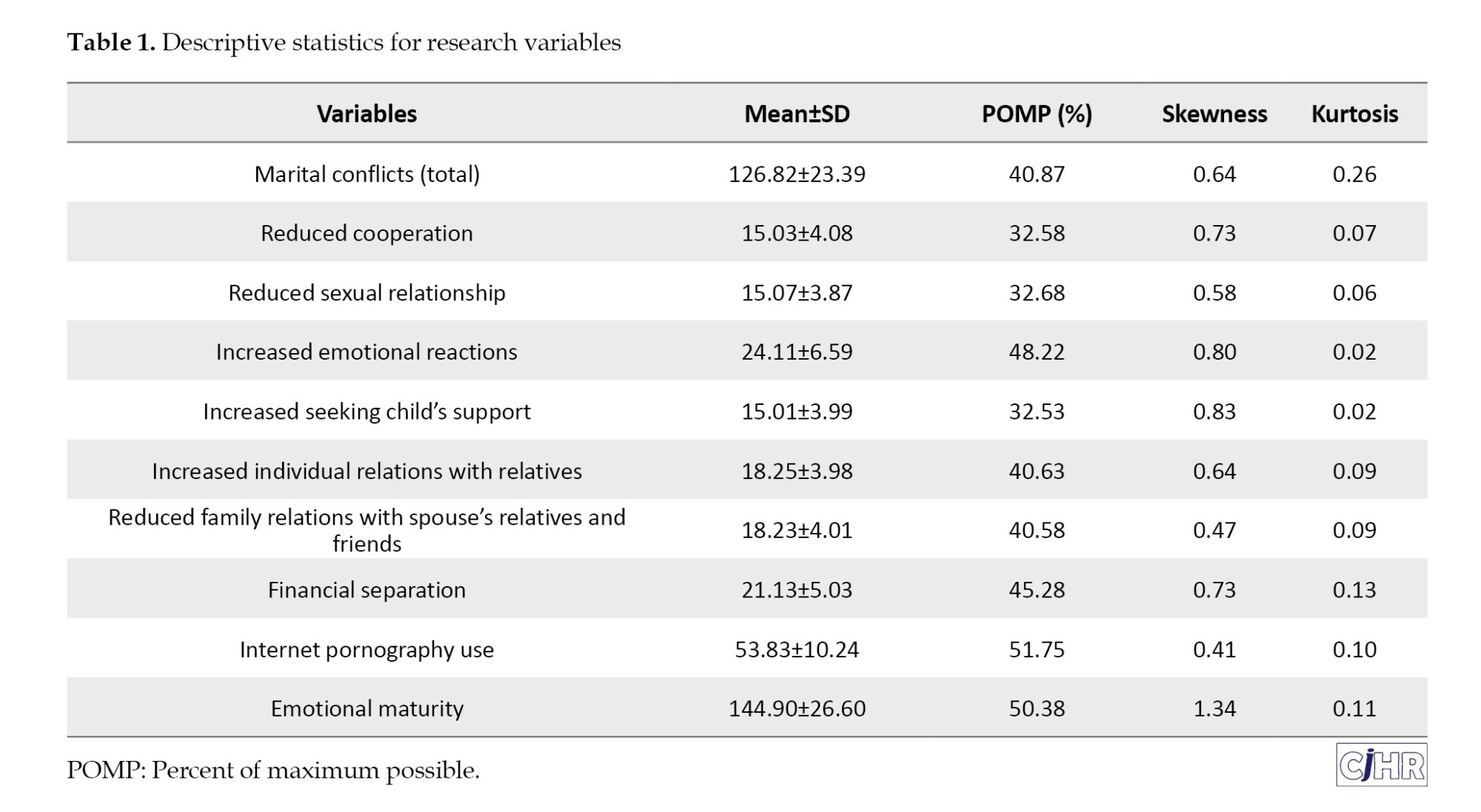 The final sample comprised 309 married students, with 160 (51.8%) female students and 149 (48.2%) male students. The mean age of the participants was 33.02±2.96 years. The mean duration of marriage was 7.45±3.12 years. Table 1 provides the descriptive statistics for the primary study variables and the various subscales comprising marital conflicts. The findings indicate a total mean score of 126.82±23.39 (POMP=40.87%) for marital conflicts, suggesting moderate conflict levels. Internet pornography use registered a mean score of 53.83±10.24 (POMP=51.75%), indicating moderate craving, while emotional maturity exhibited a mean of 144.90±26.60 (POMP=50.38%), reflecting moderate emotional maturity. The skewness and kurtosis values for the majority of the variables were observed to fall within acceptable ranges, collectively suggesting that their distributions sufficiently approximated normality. This statistical characteristic supports the appropriateness of employing parametric methods in subsequent analyses.